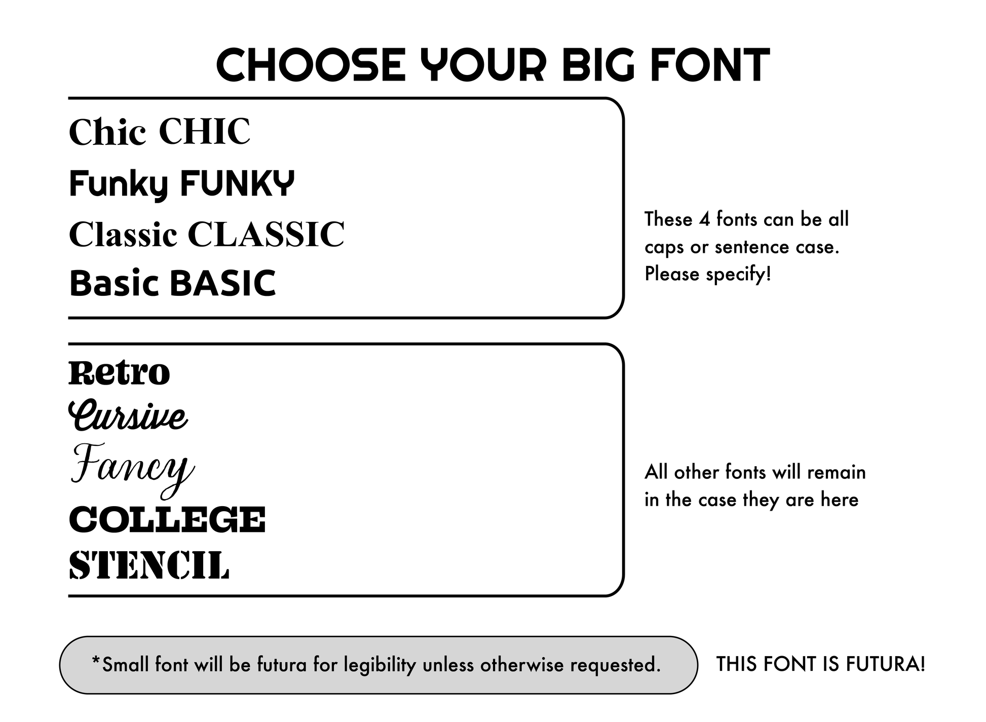 - Please note some fonts work in all caps and some don't. Please specify if you want all caps for the options that work.