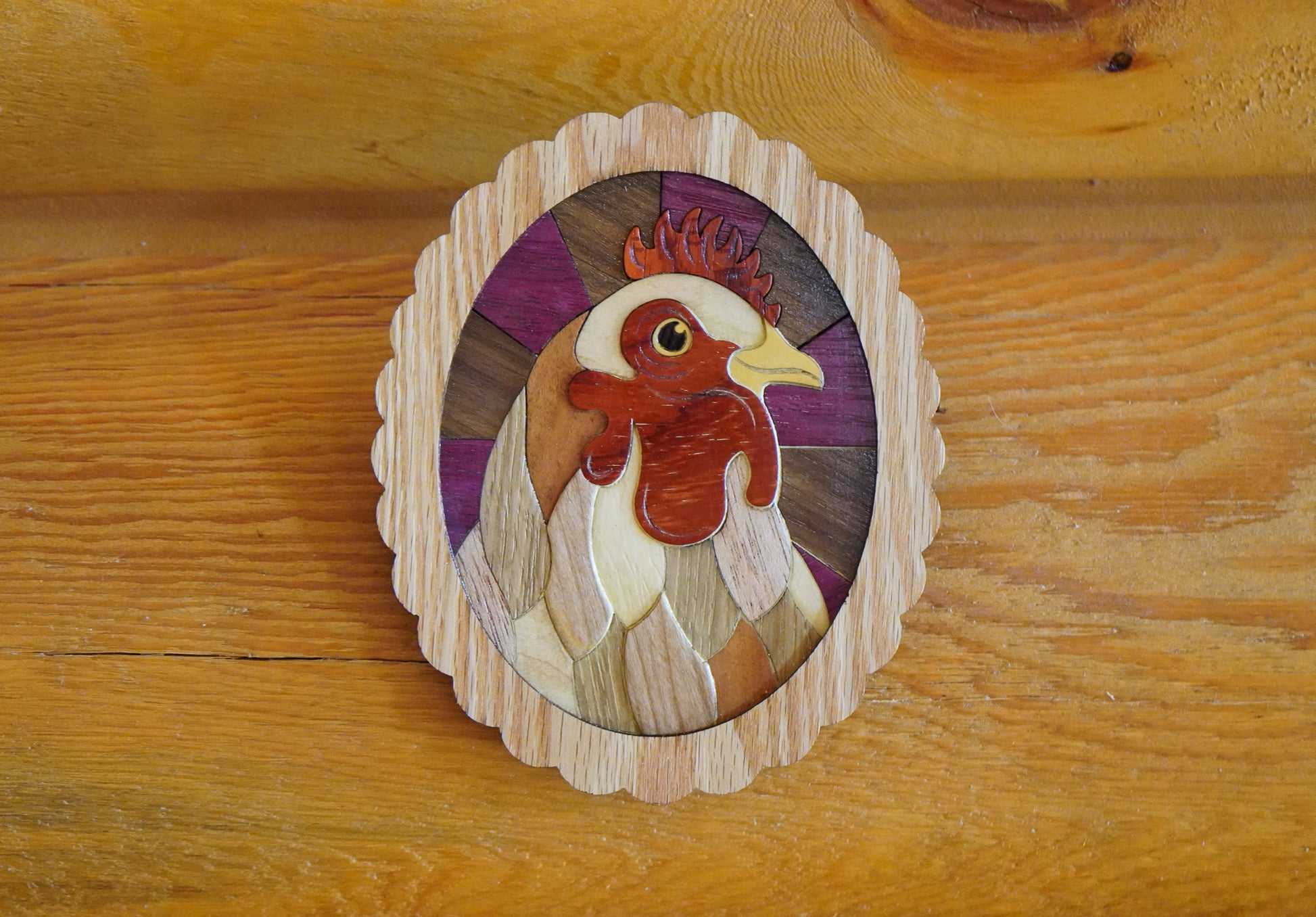 Bring a touch of rustic charm to your home with this handcrafted wooden chicken art piece. Handmade from a mosaic of exotic hardwoods, individually laser-cut and arranged to highlight the natural colors and grains of the wood—no paints or stains, just the beauty of nature itself.